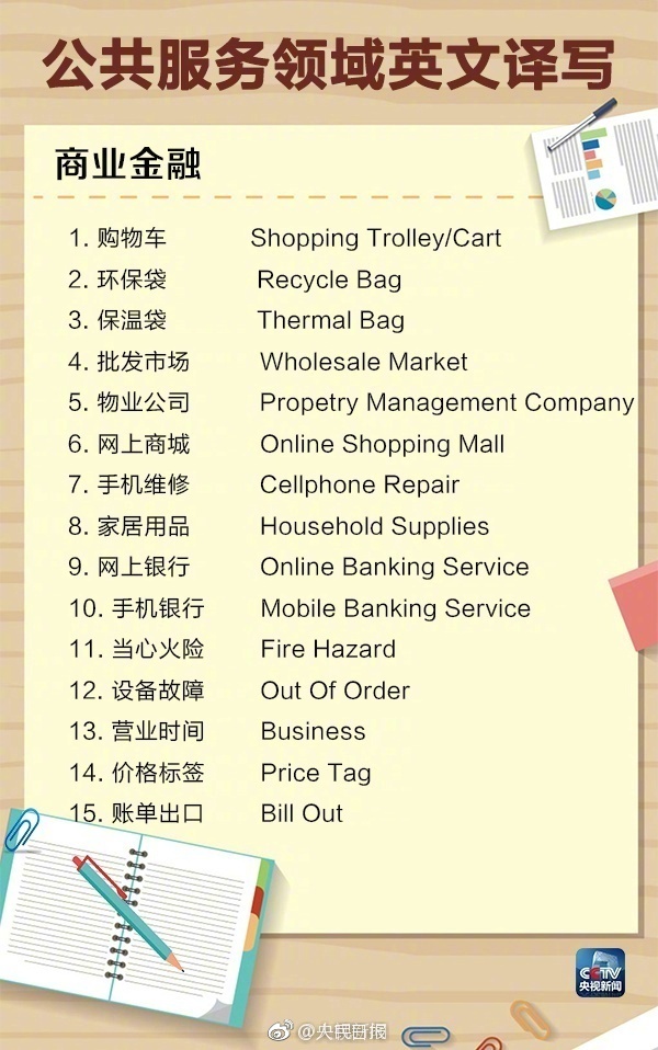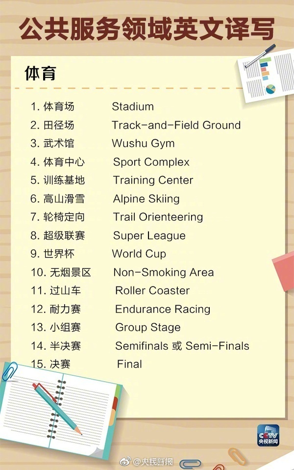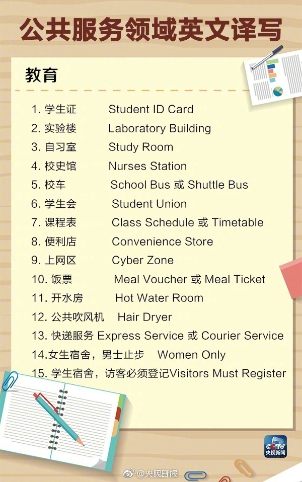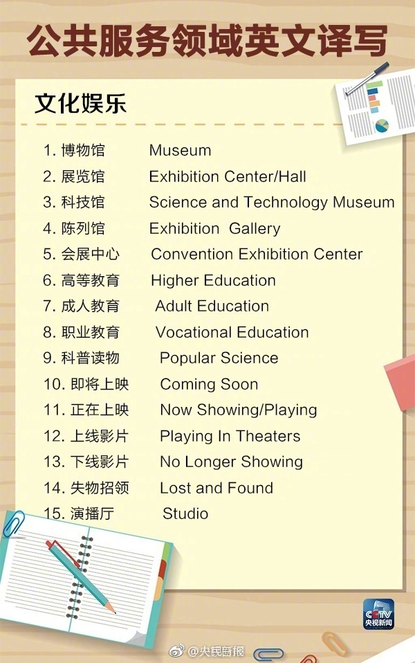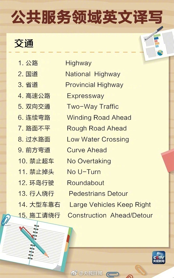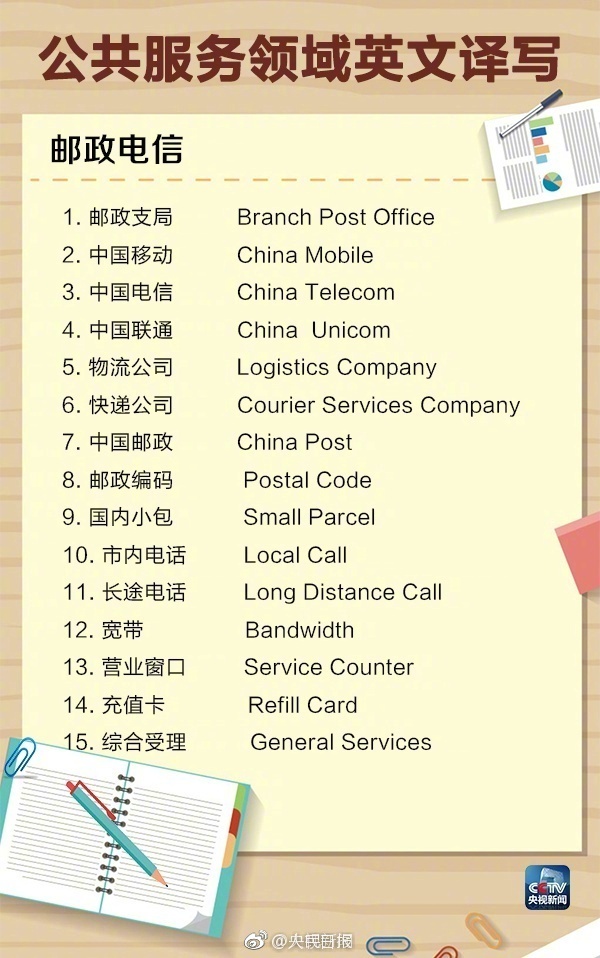下面是央視提供的公共服務(wù)領(lǐng)域英文譯寫(xiě),同時(shí)回答一下標題當中出現的三個(gè)事物的標準英文翻譯: